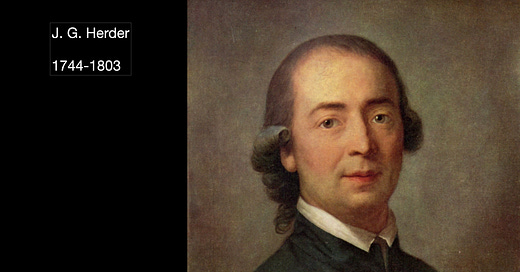 He was kind of a hippy before there was such a thing. Or more accurately, hippies are simply the an incarnation of this older Romantic worldview. The first hippies were young German Romantics. But Herder was no primitivist and no nostalgist. He—